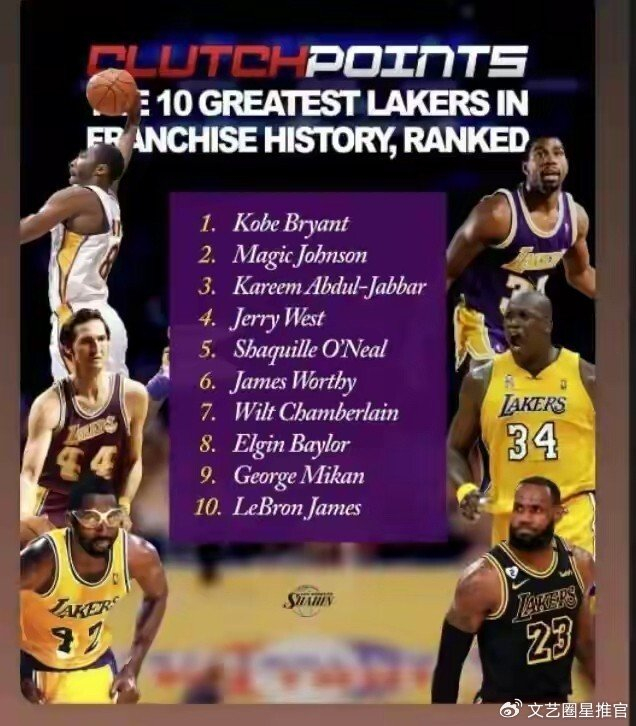 在NBA的30支球队中,湖人队可以说是联盟中的豪门了,他们队史产生了非常多的超级球星,而且至今他们也是联盟中吸金能力最强的球队,不论是关注度还是比赛成绩上,他们只要有一丁点动静,就会吸引非常多球迷关注。近日,美媒Clutchpoints就评出了湖人队史的前十球星,下面就让我们一起来看看他们都是谁吧!