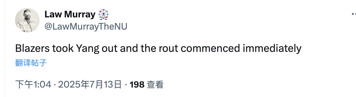 美国篮球记者Law Murray在看到第四节比赛之后,点评道:当开拓者队换下杨瀚森之后,随即溃败开始。